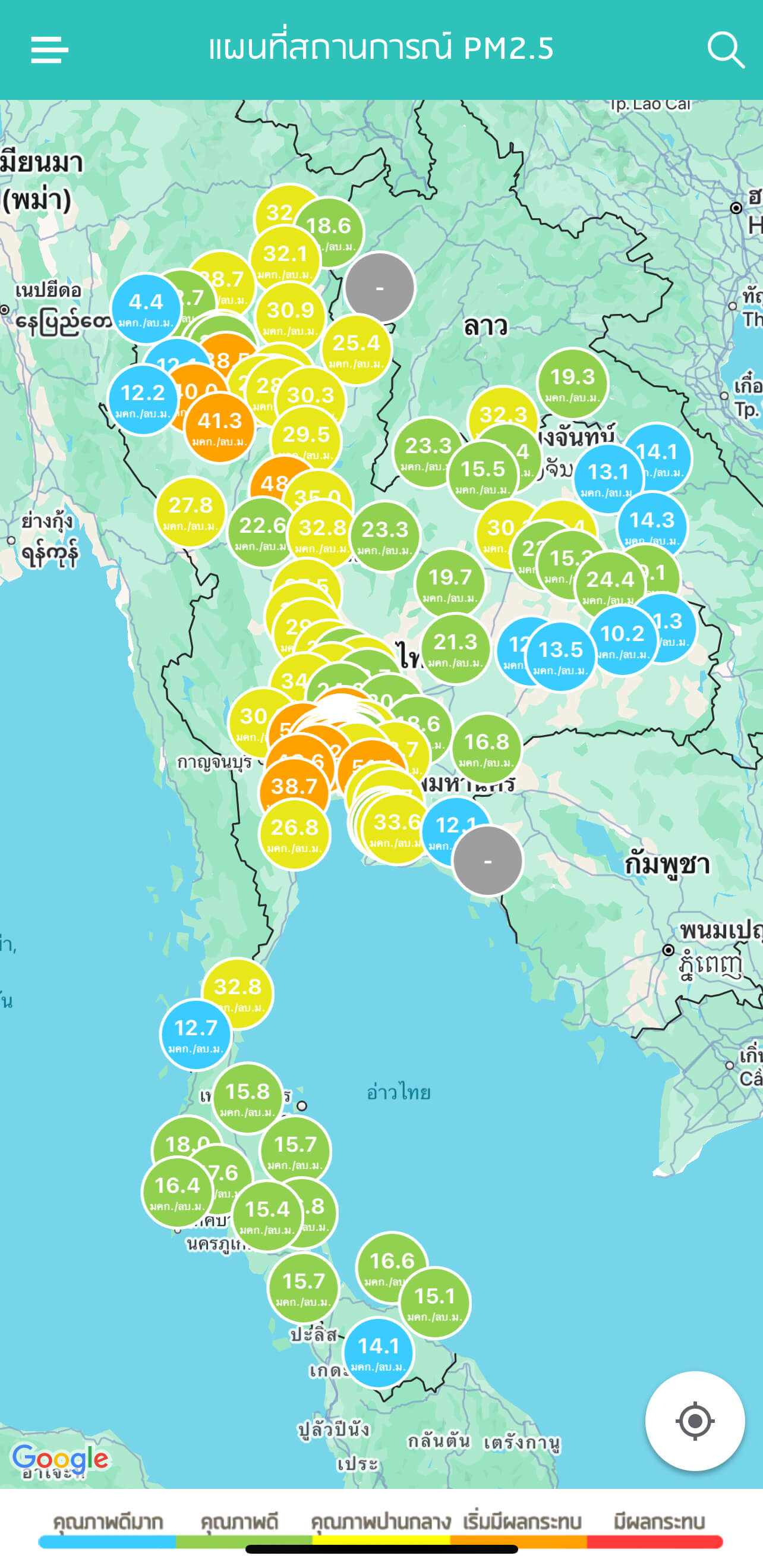 ศูนย์สื่อสารการแก้ไขปัญหามลพิษทางอากาศ (ศกพ.) กรมควบคุมมลพิษ รายงานคุณภาพอากาศประจำวันที่ 4 ธันวาคม 2568 ณ 07:00 น ภาพรวมปริมาณฝุ่นละออง PM2.5 ในประเทศ พบเกินค่ามาตรฐานในหลายพื้นที่ (สีส้ม) โดยเฉพาะอย่างยิ่ง พื้นที่กรุงเทพมหานครและปริมณฑล ในขณะที่พื้นที่ภาคอีสานสถานการณ์กลับเข้ามาอยู่ในเกณฑ์มาตรฐานทุกพื้นที่ โดยภาคเหนือ ตรวจวัดได้ 4.4 – 48.0 ไมโครกรัมต่อลูกบาศก์เมตร (มคก./ลบ.ม.) ภาคตะวันออกเฉียงเหนือ 9.3 – 32.8 มคก./ลบ.ม. ภาคกลางและภาคตะวันตก 24.5 – 49.6 มคก./ลบ.ม. ภาคตะวันออก 16.9 – 55.9 มคก./ลบ.ม. ภาคใต้ 11.8 – 32.5 มคก./ลบ.ม. กรุงเทพมหานครและปริมณฑล 27.3 – 62.1 มคก./ลบ.ม.