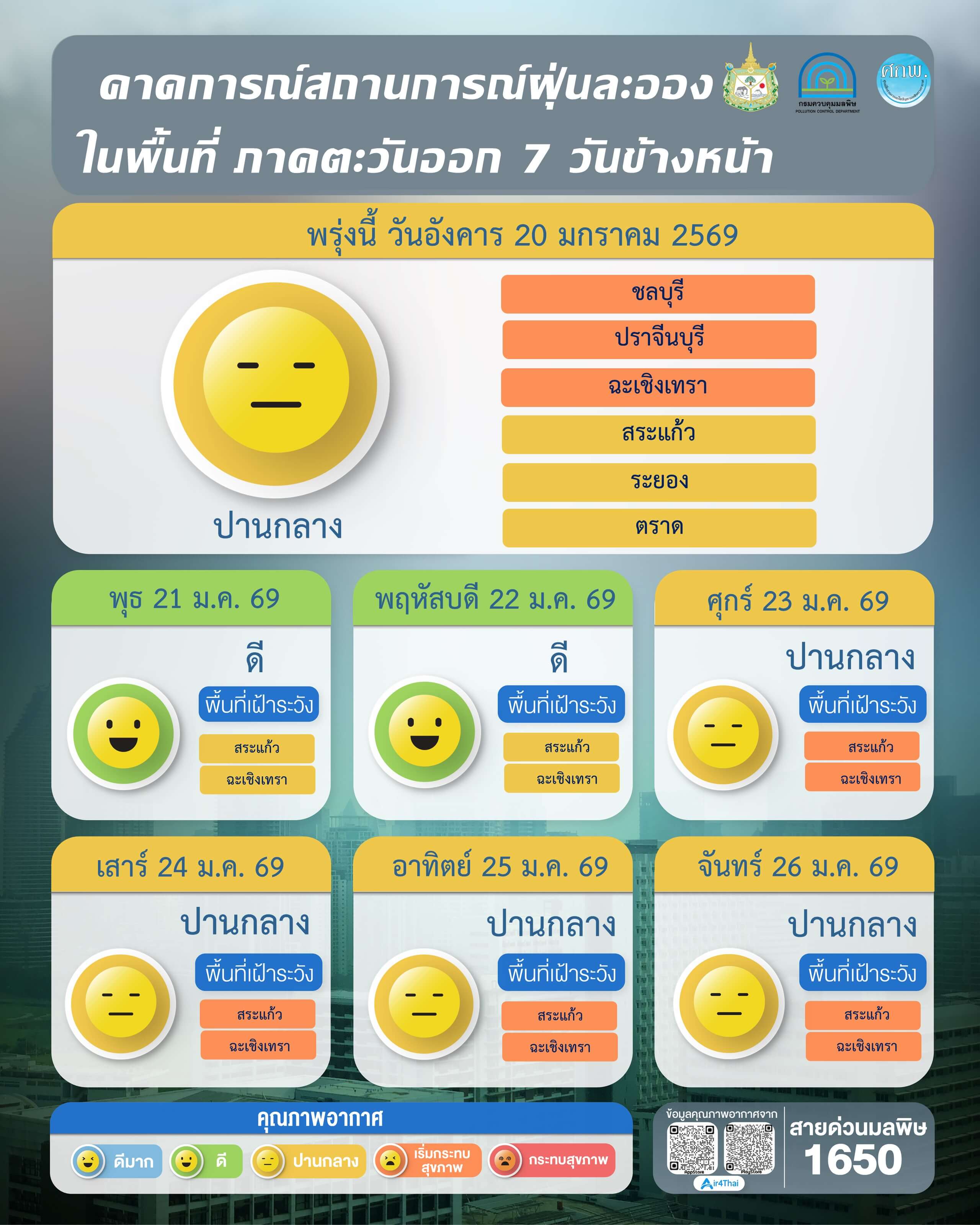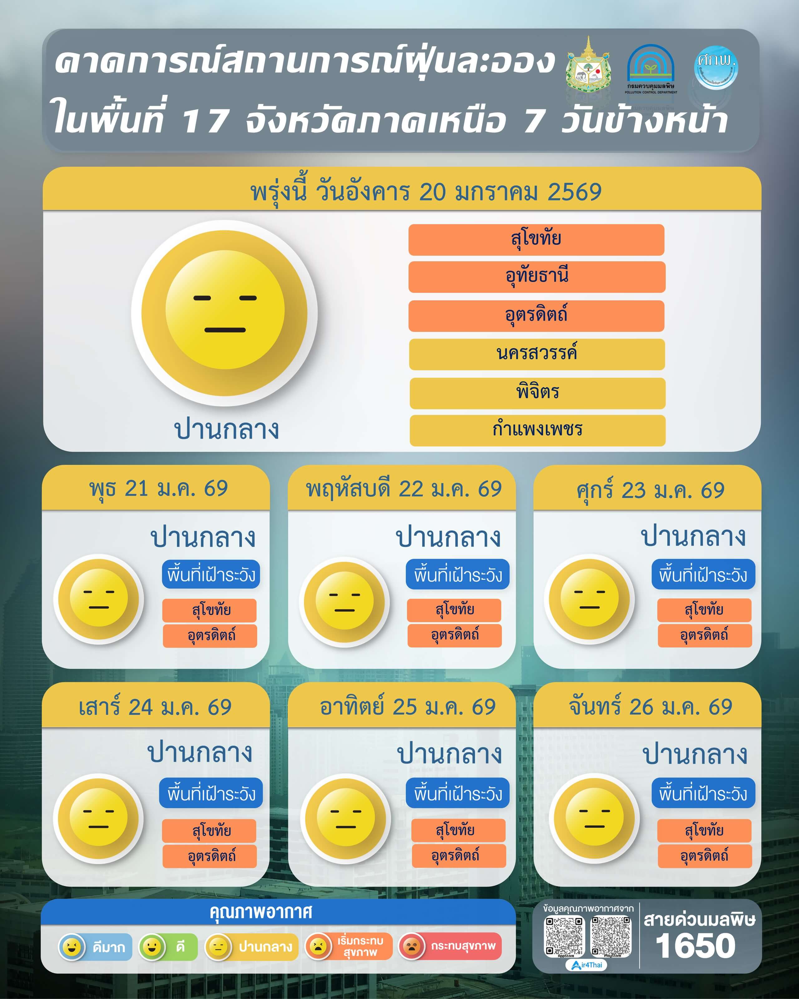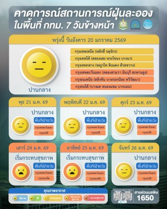 ผลการคาดการณ์สถานการณ์ฝุ่นละออง 7 วันข้างหน้า ระหว่างวันที่ 20 – 26 มกราคม 2569