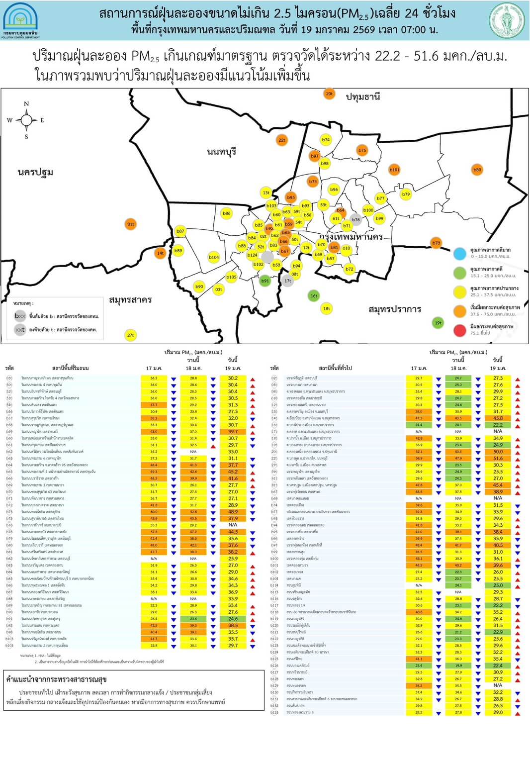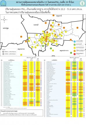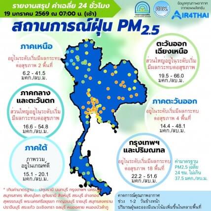 ศูนย์สื่อสารการแก้ไขปัญหามลพิษทางอากาศ (ศกพ.) กรมควบคุมมลพิษ รายงานการติดตามตรวจสอบคุณภาพอากาศ ประจำวันที่ 19 มกราคม 2569 ณ 07:00 น ภาพรวมปริมาณ PM2.5 ในประเทศพบเกินค่ามาตรฐาน31 จังหวัด ได้แก่ จ.ปทุมธานี จ.นนทบุรี กรุงเทพฯ จ.นครปฐม จ.สมุทรสาคร จ.พิษณุโลก จ.อุทัยธานี จ.สิงห์บุรี จ.สระบุรี จ.อ่างทอง จ.สุพรรณบุรี จ.พระนครศรีอยุธยา จ.กาญจนบุรี จ.ราชบุรี จ.สมุทรสงคราม จ.ปราจีนบุรี จ.สระแก้ว จ.ฉะเชิงเทรา จ.ชลบุรี จ.หนองคาย จ.หนองบัวลำภู จ.ขอนแก่น จ.กาฬสินธุ์ จ.มหาสารคาม จ.ร้อยเอ็ด จ.ชัยภูมิ จ.อุบลราชธานี จ.ศรีสะเกษ จ.นครราชสีมา จ.บุรีรัมย์ และ จ. สุรินทร์